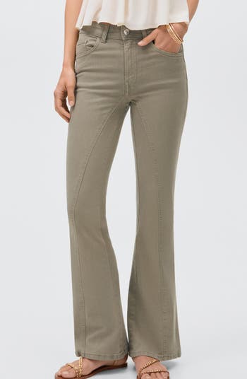 Seam details enhance the figure-elongating effect of these full-length flare jeans made from low-stretch denim in a muted hue.