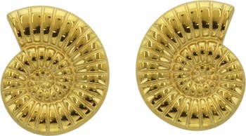A spiral shell brings oceanic texture and charm to playful stud earrings in gleaming 14-karat gold plate.