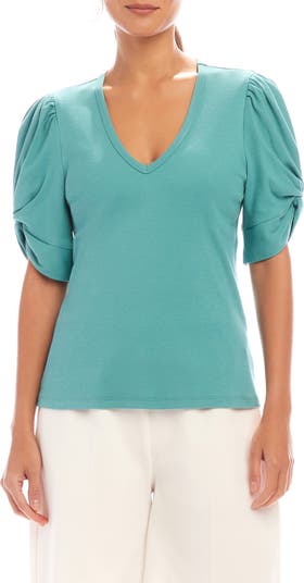 Twisted puff sleeves add voluminous charm to this versatile V-neck top made from a soft cotton- and modal-blend ribbed knit.