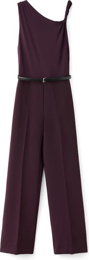 A single twisted strap creates interesting asymmetry for this belted jumpsuit made with tailored darts for a fitted shape.