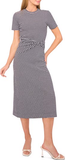 A subtle twist detail adds modern sophistication to this impeccably striped T-shirt dress.