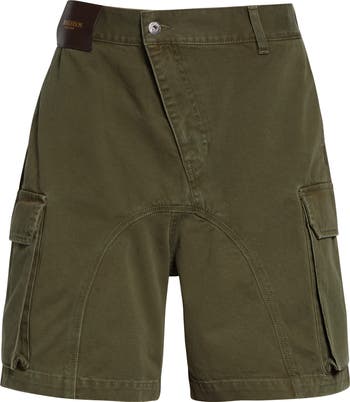 This twisted take on utility-style cargo shorts is crafted in Japan with a precariously angled fly and a voluminous gusset at the inner legs that contributes to the baggy fit. Roomy bellows cargo pockets overlap the back patch pockets, while a leather waistband patch finishes off the casual design.
