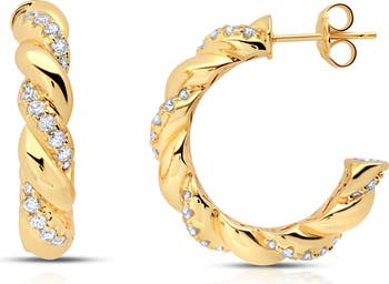 Hand-set cubic zirconia enhance the twisting silhouette of these sterling silver hoop earrings plated in 18-karat gold.