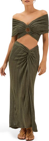 Airy open-stitch stripes and a soaring front slit lend beach-siren allure to this cover-up midi skirt topped with a flirty gathered detail.