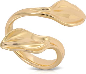 A minimalist wrap design and molten finish bring dimension and shine to a delicate ring plated in 18-karat gold.