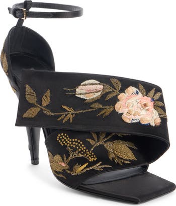 Intricate blooms are delicately embroidered with silk threads on this calfskin-leather sandal that features an elegantly undulating design.