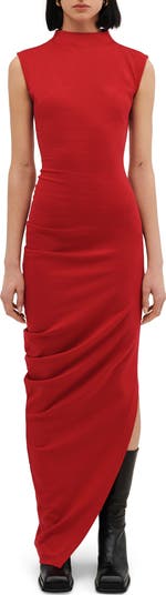 Cashmere-softened ponte fabric brings an elegant feel and drape to a sleeveless gown finished with an asymmetric hem.