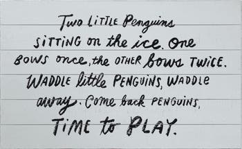 - "Two little penguins sitting on the ice. One bows once, the other bows twice. Waddle little penguins, waddle away. Come back penguins, time to play."