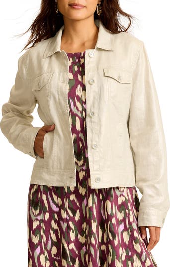 An elevated iteration of a classic trucker jacket–this one is updated in crisp linen and eye-catching iridescent shimmer.