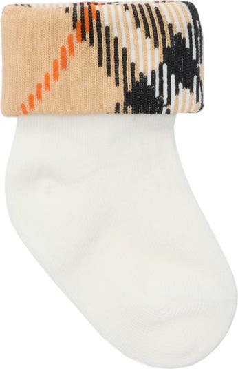 A baby gift set featuring two pairs of socks made in Italy from a cotton blend with a hint of stretch. The foldover cuffs are knitted with the Burberry Check in signature sand beige.
