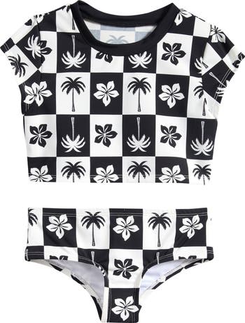 This kids’ two‑piece swimsuit features a cropped T‑shirt‑style top paired with coordinating bottoms for comfortable coverage and a sporty, pool‑ready fit.