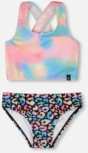 The two-piece multicolored swimsuit brings playful charm to sunny days by the pool or beach. This bathing suit includes a sporty crop top with crossed straps at the back and matching bikini bottoms in a bold multicolor leopard print. Made from recycled polyester with stretch, it ensures comfort, durability, and a perfect fit for active water fun.