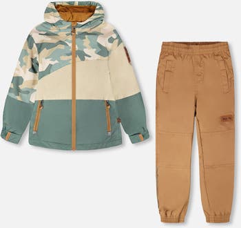 Adventurous and durable, this two-piece mid-season outerwear set in green with camouflage print keeps boys cozy and protected on windy or rainy days. The polar fleece-lined jacket and jersey-lined pants offer warmth and comfort, while recycled materials and a fluorocarbon-free BIONIC-FINISH® ECO coating provide eco-friendly water and dirt resistance. Reinforced knees, reflective details, and adjustable features make it perfect for outdoor play.