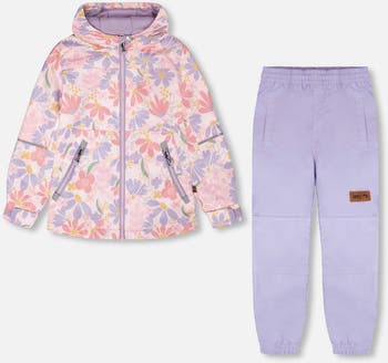 Stylish and practical, this two-piece mid-season outerwear set in pink with flower print is designed to keep young girls warm, dry, and comfortable through every spring adventure. The insulated jacket and pants feature a fluorocarbon-free BIONIC-FINISH® ECO coating, ensuring water and dirt repellency without harmful chemicals. With details like a fleece-lined hood and jacket, adjustable waistband, reinforced knees, and reflective trims, this durable set blends eco-friendly innovation with cozy everyday wear.