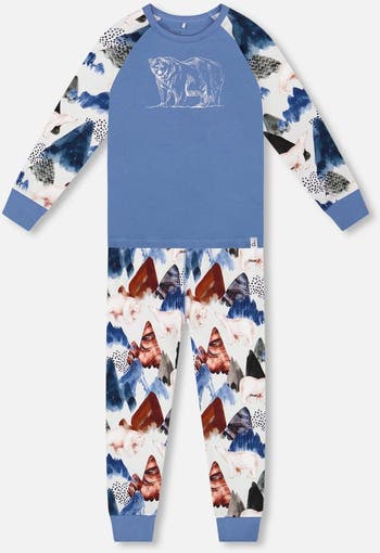 In super soft interlock fabric, this organic cotton sleepwear set is made for cozy nights and comfy mornings. A must-have for the boy who loves the great outdoors, these pajamas feature a long sleeve crew neck top with contrast raglan sleeves, a pull-on pant with a stretchy elastic waistband, and an eye-catching bear and mountain print.