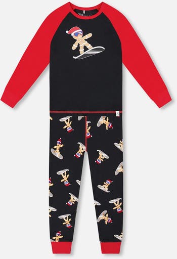 In super soft interlock fabric, this organic cotton sleepwear set is made for cozy nights and comfy mornings. A must-have for the boy with a playful sense of style, these pajamas feature a long sleeve crew neck top with contrast raglan sleeves, a pull-on pant with a stretchy elastic waistband, and an eye-catching snowboarding gingerbread man print..