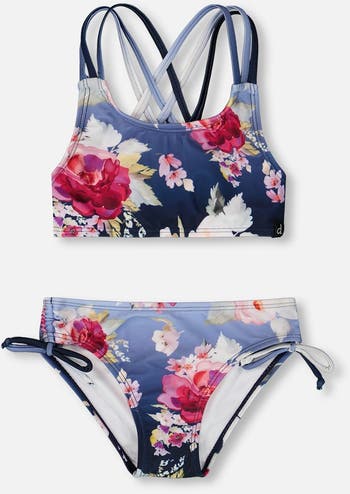 The two-piece swimsuit in blue with rose print blends chic details with playful summer style. The top features triple crossed straps at the back for a secure and stylish fit, while the bottoms are finished with adjustable side ties that add a fun and practical touch. Made from recycled polyester with stretch, this quick-drying set is part of our “Like A Fish To Water” collection.