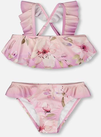 The two-piece swimsuit in purple with flower print is a sweet and playful set with ruffled crossed straps and a flared top. Made from recycled polyester with a touch of stretch, this swimsuit offers comfort, flexibility, and durability for summer adventures. A stylish and eco-friendly design from our “Like A Fish To Water” collection.