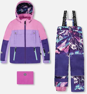 This two-piece TEKNIK snowsuit is one of the most technical ski suits we've ever made, and it's loaded with features to enhance durability, provide superior protection, and improve performance in temperatures as low as -30°C (-22°F). With a colorblocked jacket and a purple mountain print pant, this set is constructed with thin PrimaLoft insulation for maximum warmth, articulated knees and sleeves, adjustable hems and sleeves to accommodate growing kids, and taped seams at all critical areas. Waterproof, breathable, abrasion-resistant, and dirt-repellent, this set also features a removable helmet-friendly hood, snow guards to keep the elements out, a chin guard, waterproof zipper pockets, and an adjustable waistband with removable suspender straps. A polar fleece neckwarmer and a fleece lining in the jacket provide added warmth.