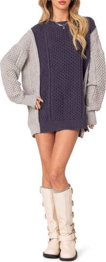 Show off your stems in this two-tone oversized sweater-dress knit with dropped shoulders.