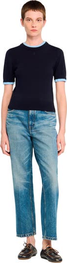 Short fine knit sweater with round neck and short sleeves with contrasting trim, adorned with a signature tag.