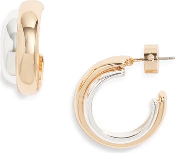 Add double the style your day and evening looks with these elegant earrings featuring connected hoops plated in golden and silvery hues.