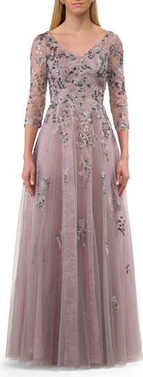 Beautiful A-line gown with two tone applique and a lace lining. V neckline and illusion three quarter sleeves. Back zipper closure.