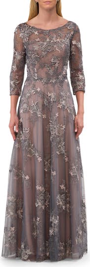 Long evening gown with two tone colors featuring a gray overlay and pink lining. Beautiful floral embroidery and sheer three quarter sleeves. Back zipper closure.
