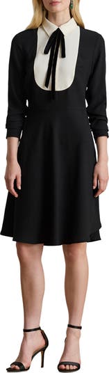 A velvety tie tethers the neck of this polished flared dress cut from soft georgette and accented with a contrasting bib.