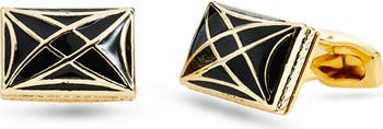 Sweeping curves balance the angular shape of cuff links highlighted with black and goldtone finishes to add polish to the sleeves of any traditional or modern formalwear. Cast from durable brass, they make a distinctive addition to any standout look.