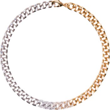 In the spirit of a bold Pre-collection, Maje has designed jewellery that plays on contrast and light. This two-tone link necklace transitions from fine gold-plated links to smooth, polished silver-tone links. A section paved with rhinestones creates a sparkling gradient effect. The smooth texture of the polished metal meets the sparkle of the set stones, for a graphic and brilliant piece.Slip it on over a tailored waistcoat to play on the contrasts.