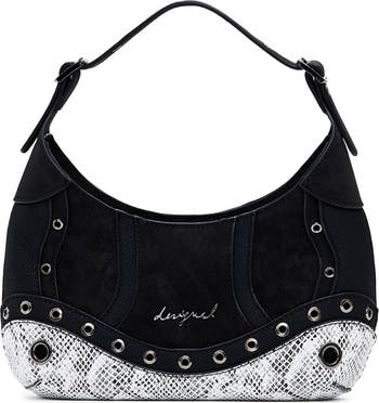 Snake-embossed trim and grommets bring an edgy aesthetic to a slim faux-leather bag suspended from an adjustable shoulder strap for convenient styling.
