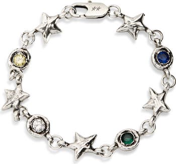 Shimmering crystals alternate with gleaming star links on this silvertone-plated bracelet that delivers balanced brilliance with sculptural rhythm.
