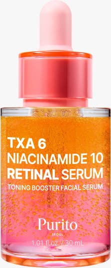 - The Purito TXA 6 Niacinamide 10 Retinal Serum combines three potent actives—Tranexamic Acid, Niacinamide, and Retinal—for visible brightening and skin-renewing results. A 6% concentration of Tranexamic Acid helps inhibit melanin formation, effectively reducing dark spots and discoloration. Meanwhile, 10% Niacinamide strengthens the skin barrier and enhances luminosity for an even, refined finish. Encapsulated Retinal provides gentle yet powerful anti-aging care.