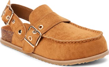 A slingback strap provides a secure fit while you stroll comfortably all day in this loafer-coded moc toe mule set on a cushion, cork-look sole.