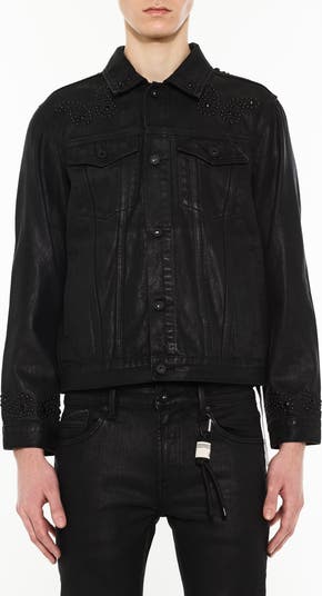 Glossy rivets in a paisley pattern mark the shoulders, yoke and sleeves of this striking wet-look denim jacket.