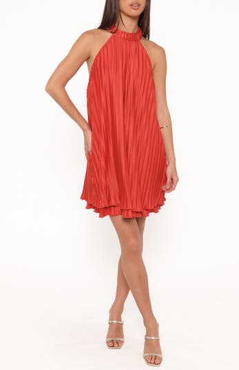 Fine allover pleats enhance the charm and texture of this flowy layered mini meant to show off your shoulders and back.