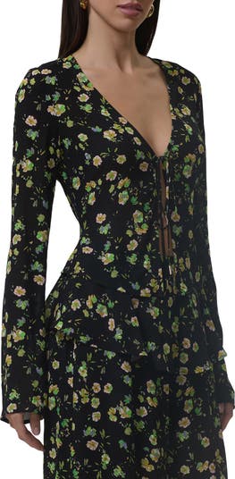 A trio of slender ties secure the front of a woven top that's patterned in a delicate garden of blooms to sweeten any look.