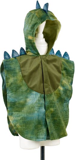 Souza costume depicting a tyrannosaurus in green, textured polyester, so it looks like real dinosaur scales. On the hood, down along the back and on the shoulders, there are serrated spikes with a blue, changing effect. The Souza costume is put on like a poncho, and on both sides there are elastics that can be opened with velcro. It comes with an attached hood and can be opened all the way up to the front with velcro.