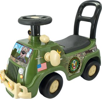 KIDDIELAND: LIGHTS N' SOUNDS MILITARY ACTIVITY TRUCK - Get ready for an action-packed adventure with the Kiddieland Lights N' Sounds Military Activity Truck! Designed for toddlers, this exciting army-style ride-on is packed with interactive features that will provide endless fun. Little ones can turn the ignition key to hear realistic engine revving sounds and slide the gear shift to simulate acceleration, giving them a thrilling driving experience. The dashboard features a flashing light-up switch that plays lively music, adding to the excitement. Plus, they can turn the steering wheel and honk the horn for even more engaging, hands-on fun! For added convenience, this ride-on includes a hidden storage compartment under the seat, perfect for stashing small toys and treasures. Parents will appreciate the safe and durable construction, ensuring long-lasting playtime adventures. This officially licensed U.S. Army ride-on is designed for toddlers aged 12 months and up and is powered by two AA batteries (included) so the fun can begin right away. Let your little soldier embark on their next mission with this feature-packed Army Activity Truck! Be All You Can Be.