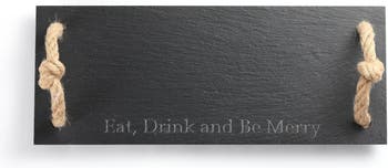 Expertly crafted, this rectangular Slate Stone Tray Platter Cheese Board is a beautiful addition to any table setting. Made from slate stone, each serving tray features unique knotted jute rope as handles for a one-of-a-kind look. They not only provide an earthy aesthetic, but are also naturally stain-resistant and easy to clean with just a damp cloth. Great for Serving hors d'oeuvres, appetizers, finger foods, charcuterie, desserts and so much more Size is 15" X 6"