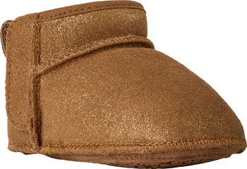 Kids can enjoy the cozy softness of this abbreviated version of a classic UGG boot boasting an ultrashort shaft and sparkling finish. The style delivers extra comfort with a lining crafted from UGGplush, a moisture-wicking textile made from a wool-rich blend but crafted to feel and wear like genuine shearling.