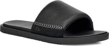 A padded leather strap and smooth contoured footbed enhance the comfort of this minimalist slide sandal punctuated with signature UGG box stitching.