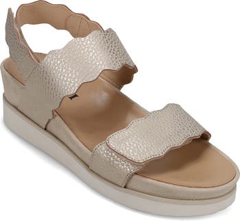 Metallic leather straps with scalloped edges bring contemporary glamour to a platform-wedge sandal grounded by a cushy, arch-supporting footbed.