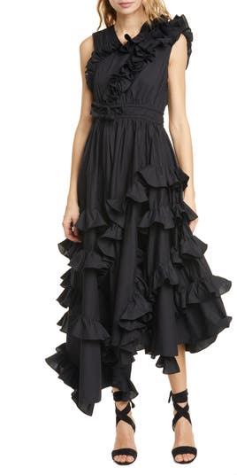 For events when you want to bring the drama while keeping your cool, this cotton wrap dress with a ruffle-wreathed, asymmetrical skirt hits all the right notes.