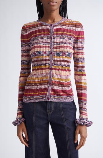 Ribbed stitches gives this cardigan its slim, body-skimming fit while the fine space-dye yarns create the cool, streaky stripes.