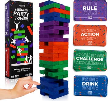 - NEW & HILARIOUS COMMANDS – Say goodbye to the basic "Girls Drink" cards. This new party game will have you performing reach-arounds (not like that, you weirdo), throwing blocks at your friends, and maybe even removing a block with your tongue!