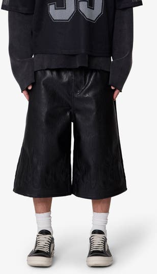 These shorts were made to set off a late-night lineup with a baggy faux-leather shape and tonal flames licking up from the hems.