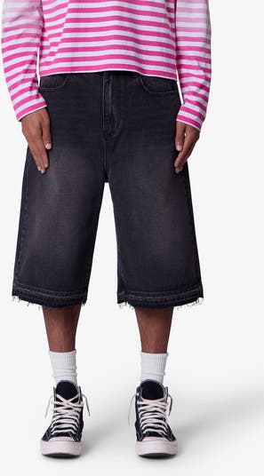 Raw edges further the grunge aesthetic of these ultrabaggy denim shorts sized to slouch like you've lived in them forever.
