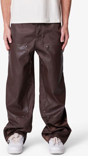 Traditional workwear inspires these ultrabaggy pants distinguished by faux-leather double knee patches and integrated rivet detailing.